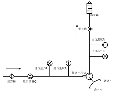 具体测量参数:环境温度、环境压力、进口空气质量流量、进口空气绝对压力、进口空气温度、出口空气绝对压力、出口空气温度、空压机实测转速、空压机实测功率、空压机进口和出口之间排出的空气质量流量。